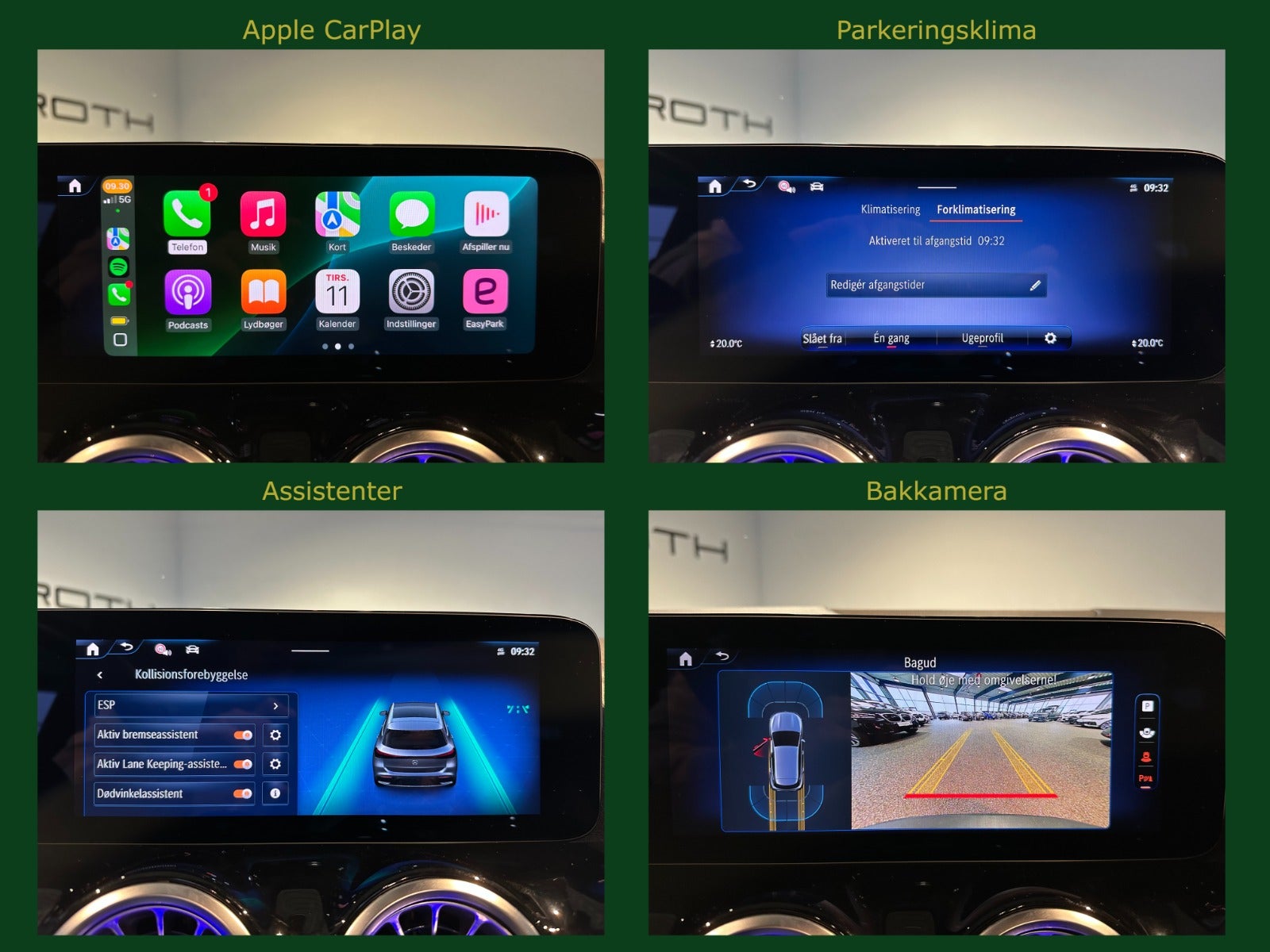Kørecomputer, Digitalt cockpit, Bagagerumsdækken, Multifunktionsrat, Læderrat, Delkunstlæderindtræk, Delalcantaraindtræk, Sportssæder, Højdejust. forsæder, El-justerbare lændestøtter, Splitbagsæde, Mørk loftbeklædning, Ambiente belysning, 18″ alufælge, Panorama glastag m. skyde/vippe funktion, El-klapbare sidespejle m/varme, LED kørelys, Fuld LED forlygter, LED baglygter, Tagræling, Mørktonede ruder i bag, Automatgear, Aircondition, Fuldaut. klima, 2 zone klima, Elektrisk kabinevarmer, Fjernb. centrallås, Keyless go, Fartpilot, Aut. nedbl. bakspejl, Udv. temp. måler, Sædevarme, 4x el-ruder, El betjent bagklap, Elektrisk parkeringsbremse, Nødlader, App integration, DAB+ radio, MBUX Navigation Premium, Musikstreaming via Bluetooth, Trådløst Android Auto, Trådløst Apple CarPlay, USB-C tilslutning, Regnsensor, Aktiv parkeringsassistent, Bakkamera m. parkeringssensorer for & bag, Dæktryksmåler, Træthedsregistrering, Skiltegenkendelse, Isofix, Automatisk lys, Fjernlysassistent, Airbag, Antispin, ESP, Vognbaneassistent, Blindvinkelsassistent, Automatisk nødbremsesystem, Forbehold for tastefejl og bildata.
