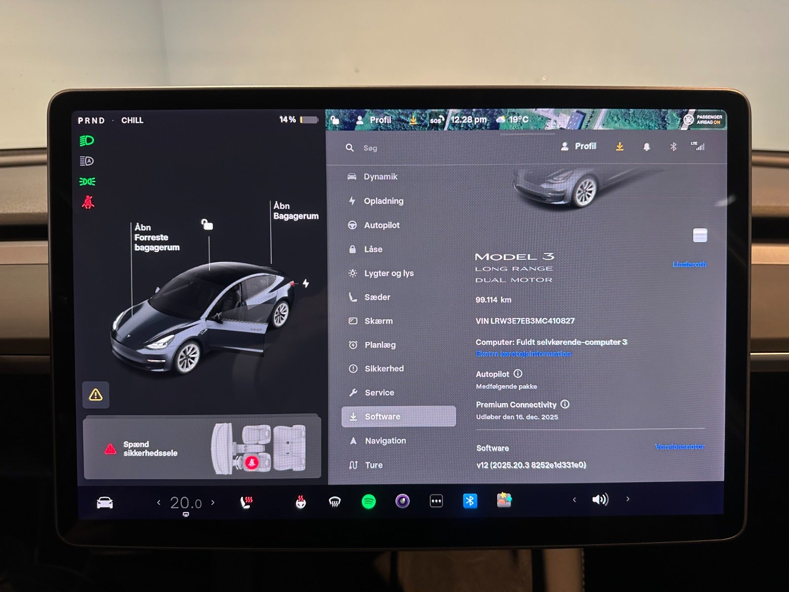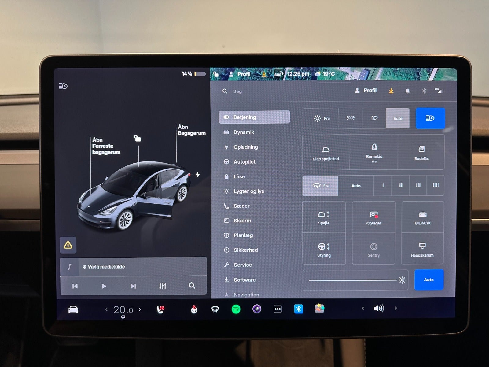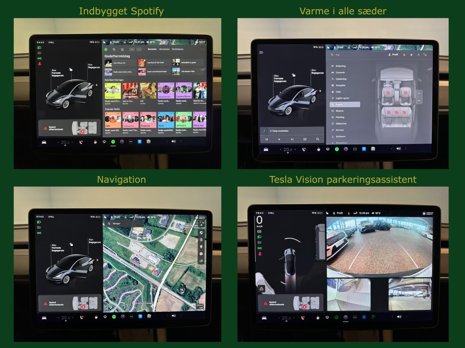 Premium soundsystem, Dash cam ” Sentry mode”, Kørecomputer, Digitalt cockpit, Dobbelt bagagerumsbund, Akustikglas i for, Multifunktionsrat, Læderrat, Kunstlæderind, Sportssæder, 12 vejs el indst. forsæder m. memory på fører, El-justerbar lændestøtte, Splitbagsæde, 19″ alufælge, Vinterhjul, Panorama glastag, El-klapbare sidespejle m/varme, Tågelygter, Fuld LED forlygter m. fjernlysassistent, LED baglygter, Mørktonede ruder i bag, Aftageligt træk til 1.000 kg., Varme i rat, Aircondition, Fuldaut. klima, Elektrisk kabinevarmer, Varmepumpe, Fjernb. centrallås, Keyless entry & go, Fartpilot, Adaptiv/aktiv fartpilot ACC, Aut. nedbl. bakspejl, Udv. temp. måler, Sædevarme, Varme i bagsæde, 4x el-ruder, El betjent bagklap, Frunk, Elektrisk parkeringsbremse, Trådløs mobilopladning, Automatisk forvarmning af batteri, App integration, DAB radio, Navigation, Håndfrit til mobil, Musikstreaming via Bluetooth, Internet, USB-C tilslutning, Alarm, Regnsensor, Multifunktions parkerings kamera m. sensor for & bag ”Tesla Vision parkeringsassistent”, Videoovervågning, Dæktryksmåler, Træthedsregistrering, Førerovervågning med advarsel, Skiltegenkendelse, Isofix, Automatisk lys, Fjernlysassistent, Airbag, Antispin, ESP, Vognbaneassistent, Blindvinkelsassistent, Automatisk nødbremsesystem, Stemmebetjening