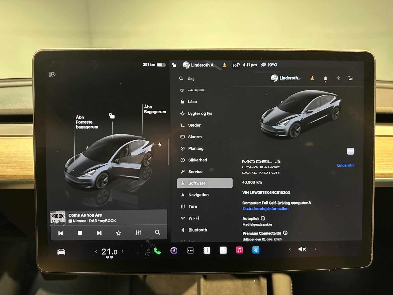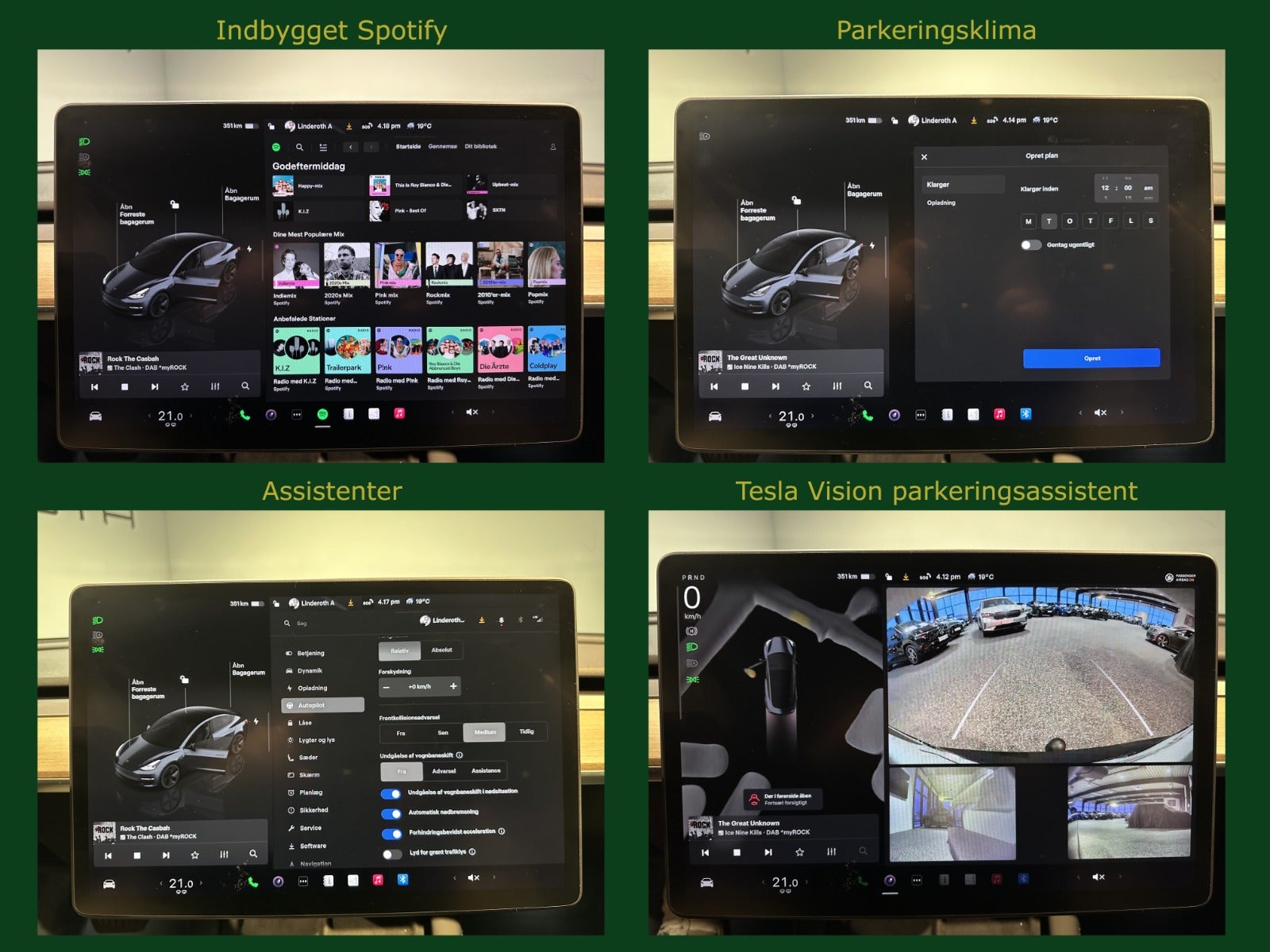 Premium soundsystem, Dash cam” Sentry mode”, Kørecomputer, Digitalt cockpit, Akustikglas i for, Multifunktionsrat, Læderrat, Kunstlæderindtræk, 12 vejs el indst. forsæder m. memory på fører, El-justerbar lændestøtte, Splitbagsæde, Ambiente belysning, Panorama glastag, 18″ alufælge, El-klapbare sidespejle m/varme, Tågelygter, Fuld LED-forlygter m. fjernlysassistent, LED-baglygter, Aftageligt træk til 1.000 kg., Automatgear, Varme i rat, Aircondition, Fuldaut. klima, Elektrisk kabinevarmer, Varmepumpe, Fjernb. centrallås, Keyless entry & go, Adaptiv/aktiv fartpilot ACC, Aut. nedbl. bakspejl, Udv. temp. måler, Sædevarme, Varme i bagsæde, 4x el-ruder, El-betjent bagklap, Frunk, Elektrisk parkeringsbremse, Automatisk forvarmning af batteri, Type-2 ladekabel, App-integration, Navigation m. DAB, BT, USB-C tilslutning, Alarm, Regnsensor, Multifunktions parkerings kamera m. sensor for & bag ”Tesla Vision parkeringsassistent” , Videoovervågning, Træthedsregistrering, Skiltegenkendelse, Isofix, Automatisk lys, Fjernlysassistent, Lygtevasker, Antispin, ESP, Vognbaneassistent, Blindvinkelsassistent, Automatisk nødbremsesystem, Stemmebetjening, Auto hold.
